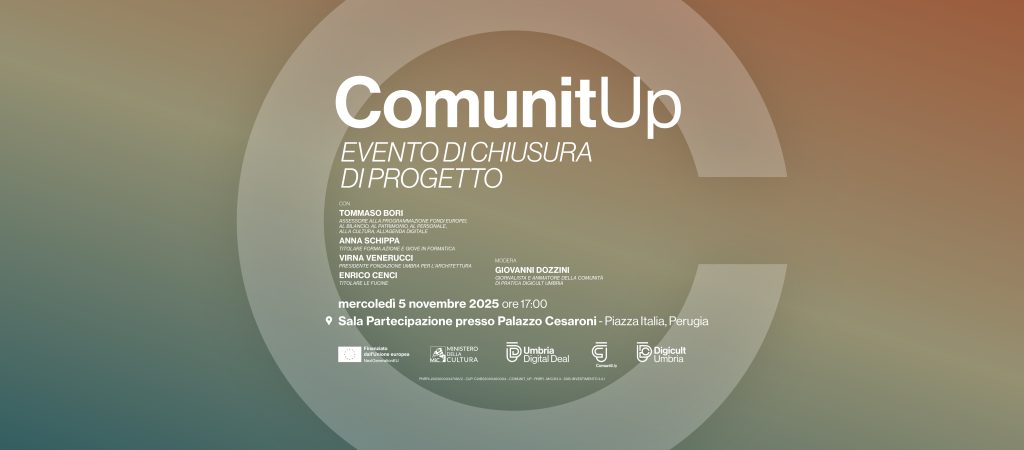 Comunit UP è un progetto finanziato nell’ambito dell’avviso “Capacity building per gli operatori della cultura per gestire la transizione digitale e verde”/ azione A I, finalizzato a sostenere la ripresa e il rilancio delle imprese e organizzazioni culturali e ricreative attive nella regione Umbria, fornendo loro strumenti, conoscenze utili e buone pratiche per affrontare le sfide legate all’innovazione tecnologica e per sfruttare al meglio le opportunità offerte dal digitale nel settore culturale.